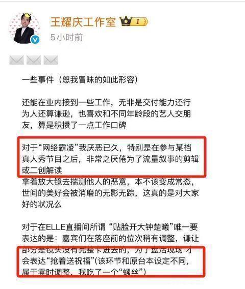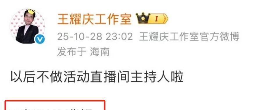 这场戏一出来,#王耀庆贴脸钟楚曦放大特写#就迅速登上了热搜榜。眼看舆论发酵,王耀庆工作室28日深夜率先做出回应:以后我不担任活动直播间的主持了,觉得不好玩,也不想背锅啦。