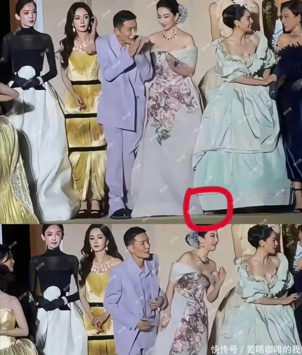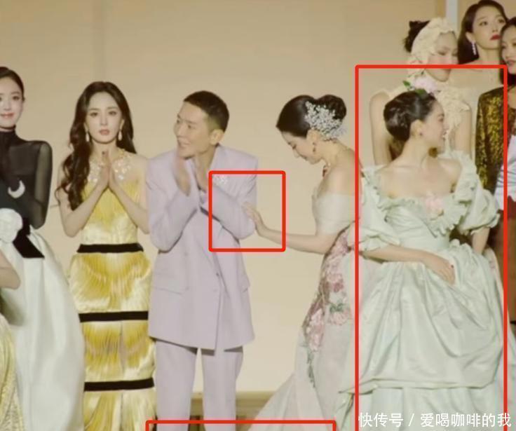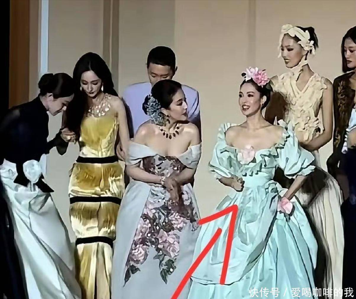 挺有意思的是,其他的影后都悄悄靠到一边去了,唯独她一直站在中间,一动不动。就算礼服裙摆拖得够长,她也毫不在意,一直纹丝不动,还特别贴近刘亦菲,站在最中间。